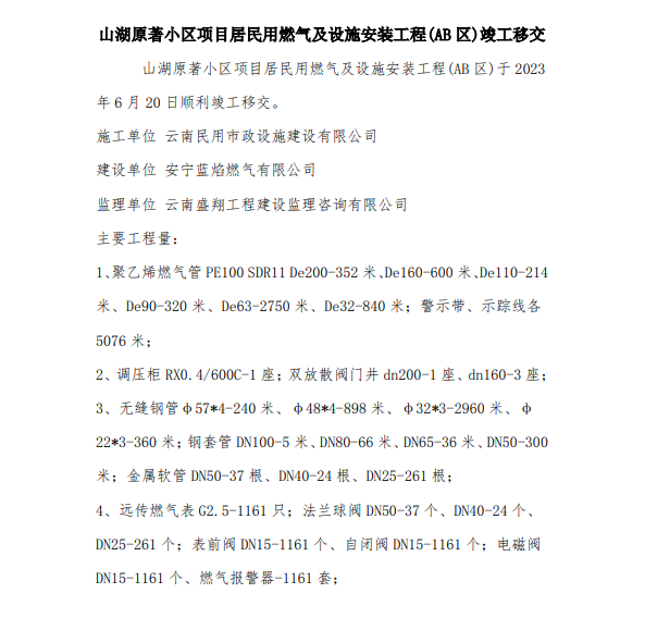 山湖原著小區(qū)項(xiàng)目居民用燃?xì)饧霸O(shè)施安裝工程(AB區(qū))竣工移交