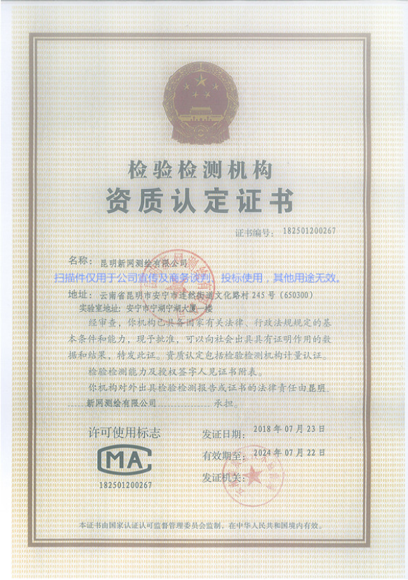公司2005年5月取得云南省測繪局丙級資質(zhì),2014年4月取得國家乙級測繪資質(zhì)證書,證號:乙測資字53100014號,2016年6月取得云南住房和城鄉(xiāng)建設(shè)廳:建設(shè)工程質(zhì)量檢測資質(zhì)證書,證號:建檢字第20150090104號,公司經(jīng)營范圍:地理信息系統(tǒng)工程、工程測量、不動產(chǎn)測繪(房產(chǎn)測繪、地籍測繪)、工程檢測。