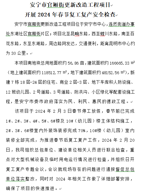 安寧市官廂街更新改造工程項目開展2024年春節(jié)復(fù)工復(fù)產(chǎn)安全檢查